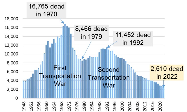 Evolución de las muertes por accidentes de tráfico en Japón entre 1948 y 2022. Fuente.